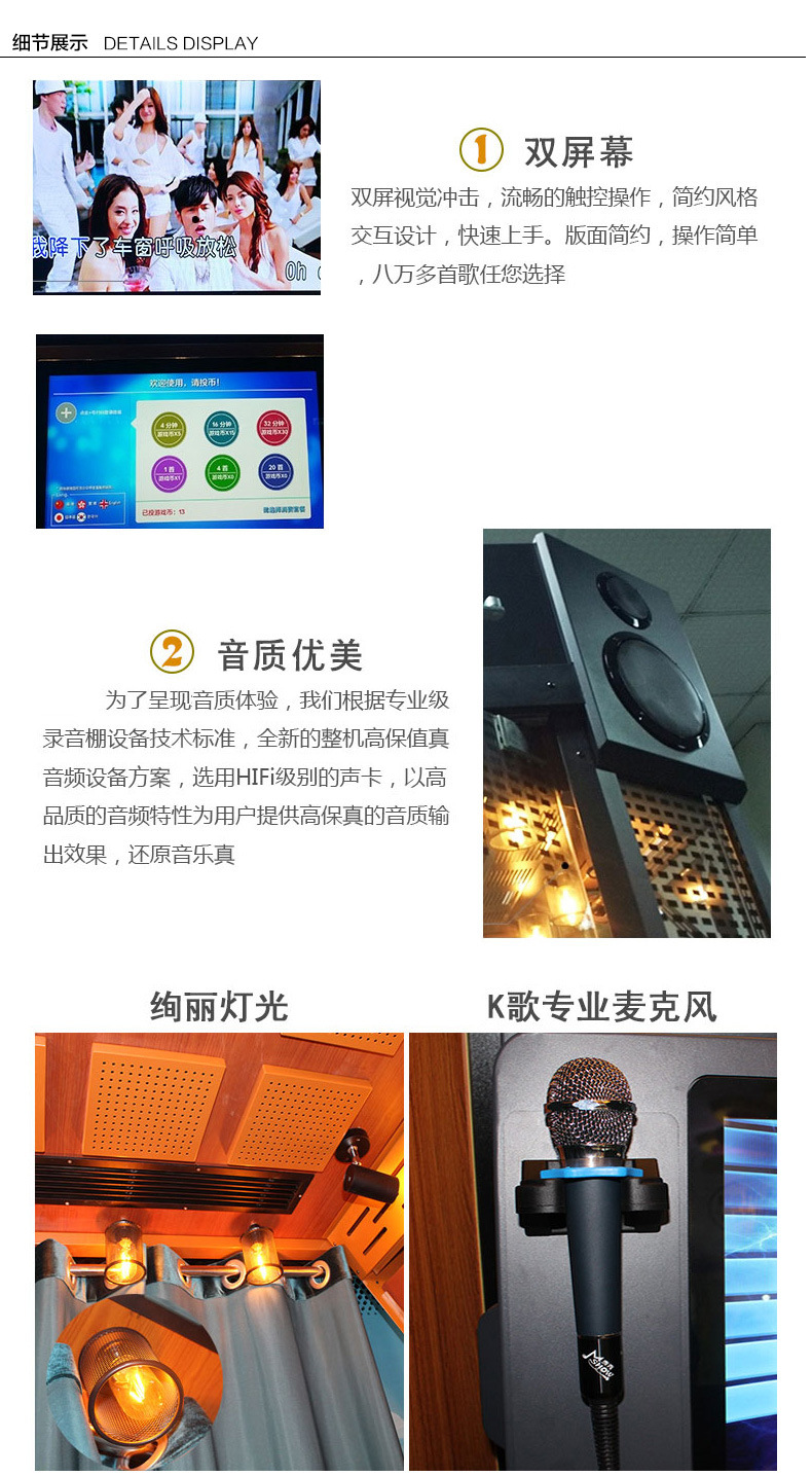 1.包廂式設(shè)計(jì),美觀、時(shí)尚、大方,制作精美,裝飾豪華時(shí)尚,迷你KTV唱歌房(可添加朗讀功能),內(nèi)部表面墻紙隔音膜采用韓國(guó)納米技術(shù)制造,隔音、環(huán)保、健康、舒適。