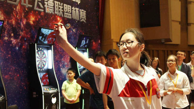 訓(xùn)練場上,57中一名女生右腿略彎支撐身體,橫向站立,側(cè)身、瞄準(zhǔn)、擲鏢,投中,順暢地完成了這一系列動作。接著第二次,第三次…… 在這間教室內(nèi),7,8臺電子飛鏢機(jī),每個鏢靶都已經(jīng)插滿了針眼,可想訓(xùn)練之艱苦。這門選修一直吸引了很多學(xué)生參加,但是只有基礎(chǔ)的學(xué)生,練習(xí)成績過關(guān)的學(xué)生,才能成為學(xué)校運動隊一員,代表學(xué)校參加比賽。或許不久將來,在國內(nèi)外飛鏢比賽賽場上,會更多一些天賦爆棚的新生代選手。