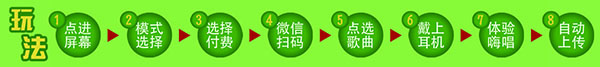 微信掃描登錄機(jī)器→觸摸屏點(diǎn)歌→戴耳機(jī)演唱→錄音后微信分享
